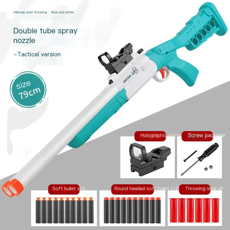 • Mode de tir : chargement manuel, fonctionnement simple et rapide, rechargement rapide et préparation à la volée à double canon, vous offrant une expérience de tir intense. • Portée de tir : avec une portée de 8 à 10 mètres, il peut facilement atteindre la cible dans les jeux à courte portée, rendant chaque tir plein de puissance. • Un coup trois balles : équipé d'une douille à 3 trous pour tirer une balle souple à trois trous. • Conception d'éjection de cartouche à double canon : fonction d'éjection de cartouche à double canon, appuyez deux fois sur la gâchette pour obtenir un tir continu. Chaque fois que vous tirez, appuyez sur le canon pour charger la cartouche et la cartouche sortira automatiquement, simulant l'action d'éjection d'un vrai fusil de chasse. • Matériau : Fabriqué en plastique ABS, il est durable et solide, tout en restant léger, ce qui le rend facile à utiliser pendant de longues périodes sans se fatiguer.