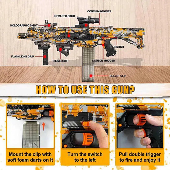 • Conception de sécurité des projectiles : il utilise des fléchettes en mousse sûres, souples et élastiques, qui conviennent aux enfants et aux adultes et ne causeront aucun dommage aux personnes ou aux objets. Les balles sont légères, faciles à nettoyer après le tir et peuvent être recyclées plusieurs fois.