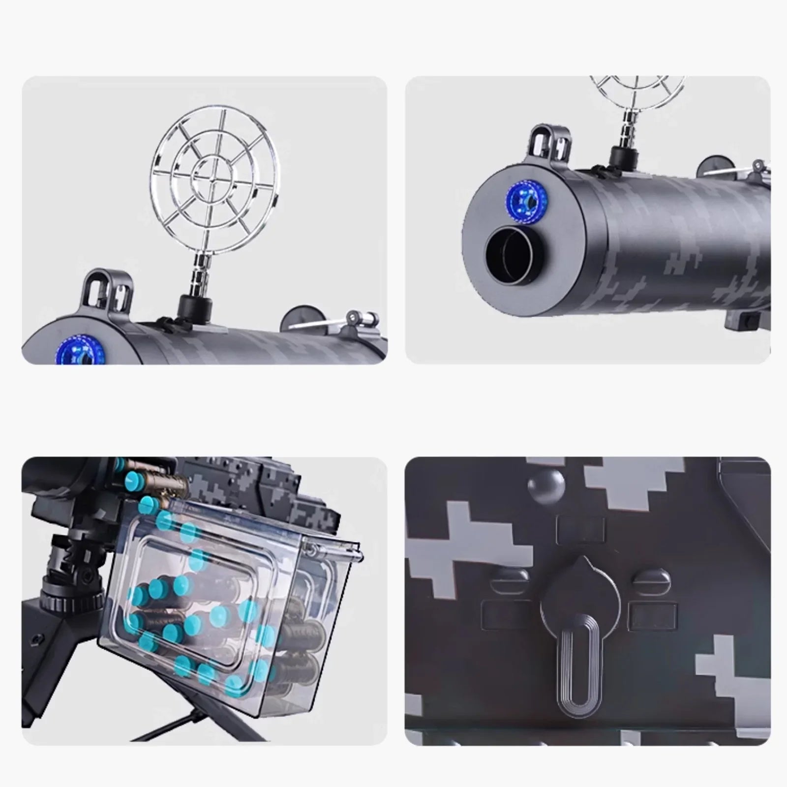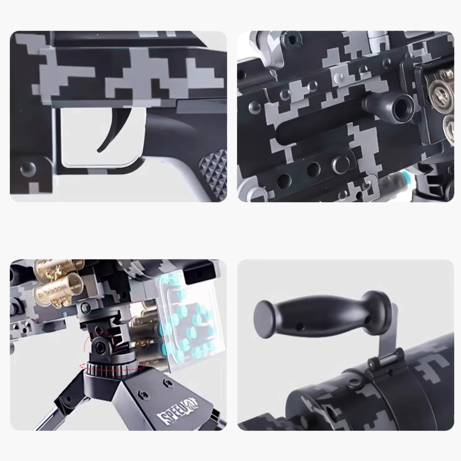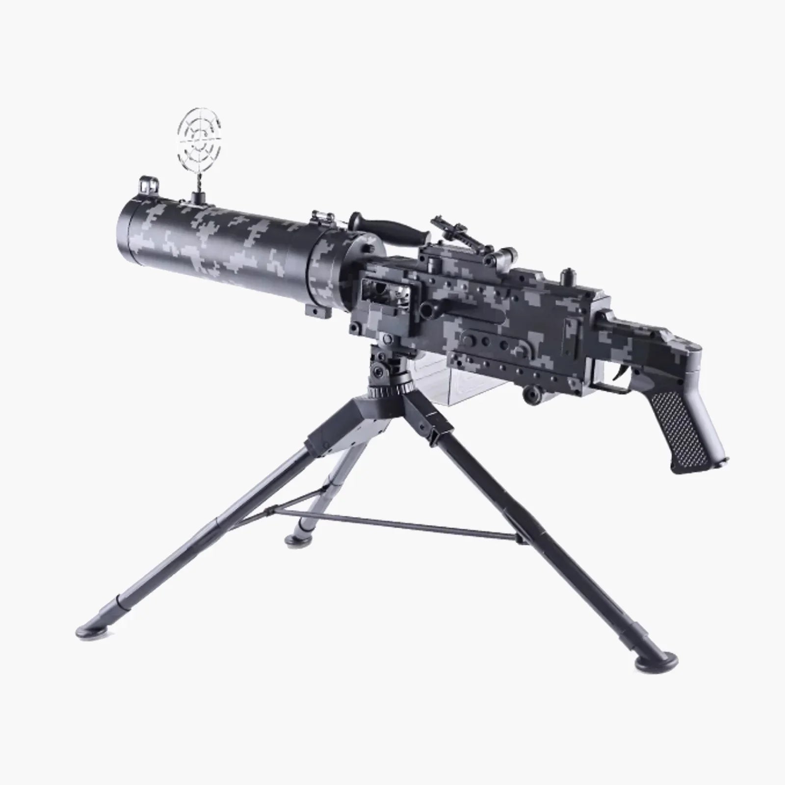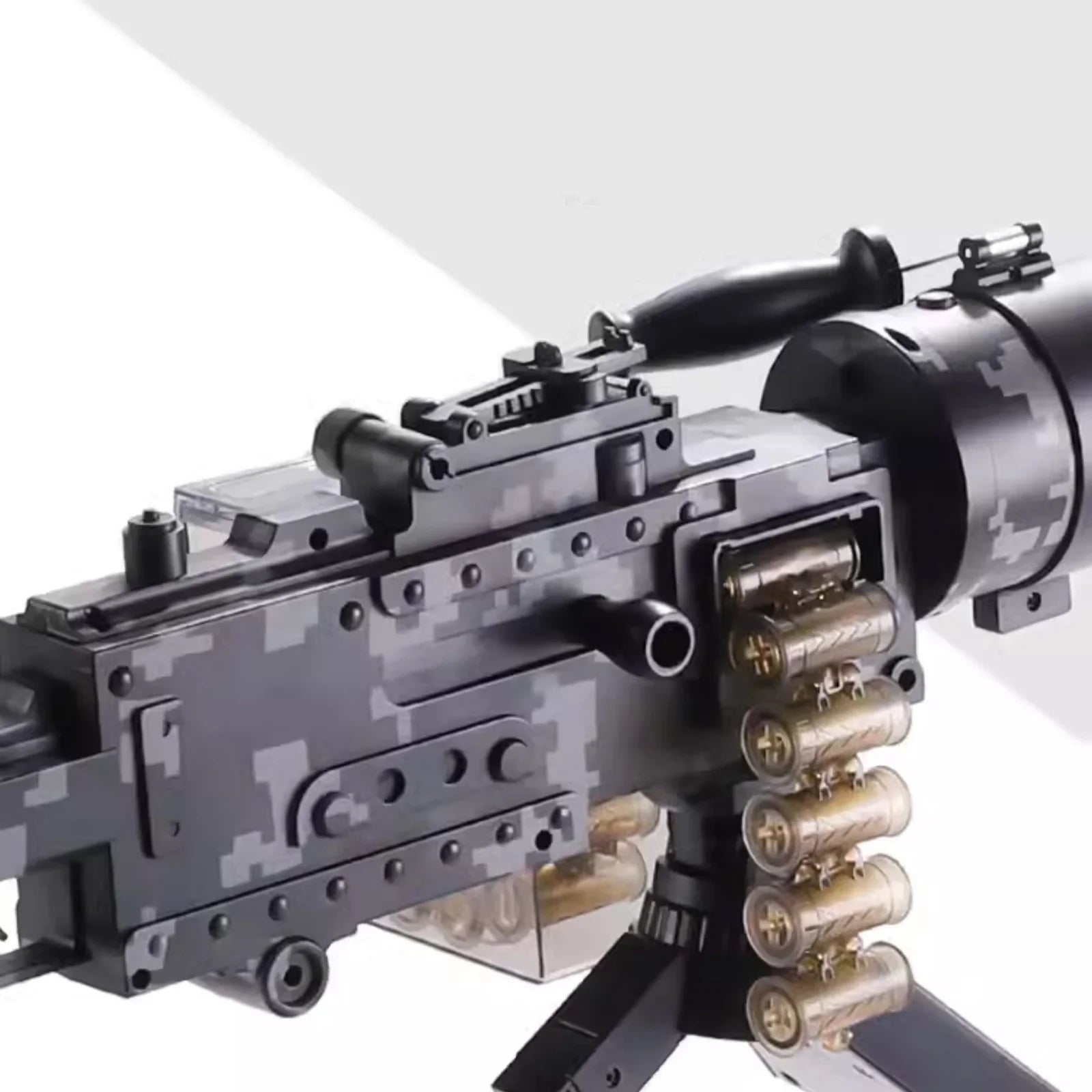 Mode de tir : basculez facilement entre les modes manuel et automatique, ce qui permet non seulement de réaliser des tirs précis en tête-à-tête, mais également de réaliser des rafales rapides, vous permettant de toujours rester actif au combat et de supprimer facilement l'ennemi. Portée : La portée de tir est d'environ 32,8 à 49,2 pieds. Équipé d'un trépied : vous n'avez pas à vous soucier trop des vibrations du corps du pistolet lors du tir, garantissant que chaque tir est aussi précis que possible. Alimentation par courroie : Équipé d'une courroie de grande capacité, il peut contenir 30 à 50 cartouches de balles souples à la fois, sans rechargement fréquent, vous permettant de profiter de la sensation de tir en rafale rafraîchissante.