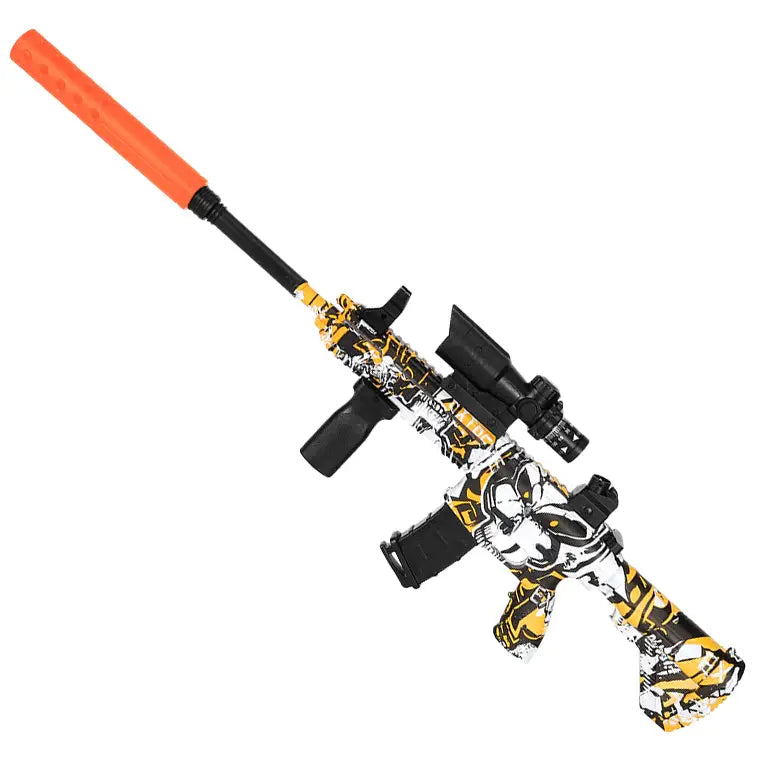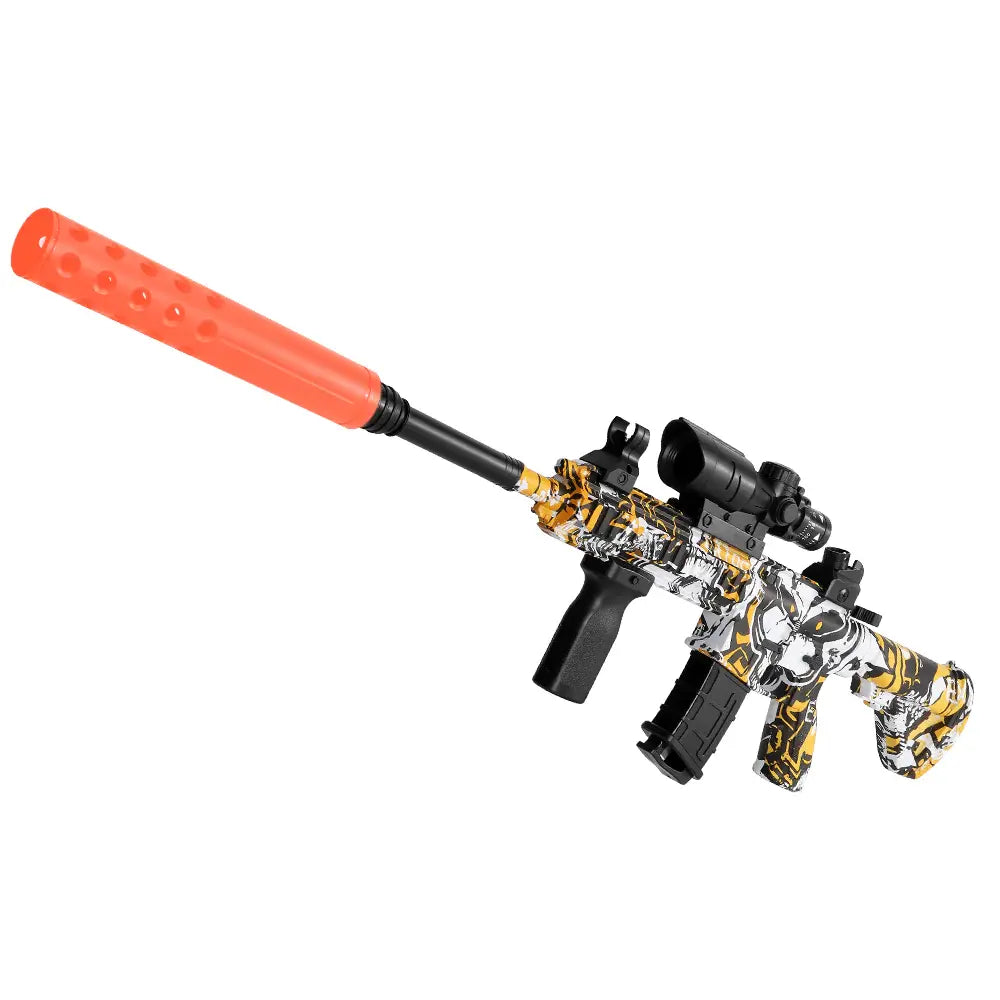 Mode de prise de vue : mode de prise de vue entièrement automatique, qui peut augmenter la vitesse de tir des balles de gel. Il est alimenté par une batterie rechargeable lithium-ion 7,4 V intégrée avec un câble de chargement USB, et aucun rechargement manuel n'est requis. Vitesse de tir et portée de tir : La vitesse est d'environ 100 FPS et la distance maximale est de 5 à 10 mètres. Chargeur à chargement multi-balles : Équipé d'un chargeur de grande capacité, plusieurs balles peuvent être chargées à la fois, réduisant ainsi les problèmes de chargement fréquent. Apparence cool : la conception de la peau de crâne jaune, noire et blanche, avec un silencieux orange et l'apparence multicolore ajoute un charme visuel. Équipement de combat : équipé d'un silencieux, d'une lunette, d'un chargeur, d'une poignée avant, de viseurs avant et arrière en fer et de lunettes de sécurité, qui améliorent la fonctionnalité, le sens tactique et la sécurité de ce pistolet à gel et offrent aux joueurs une meilleure expérience de tir