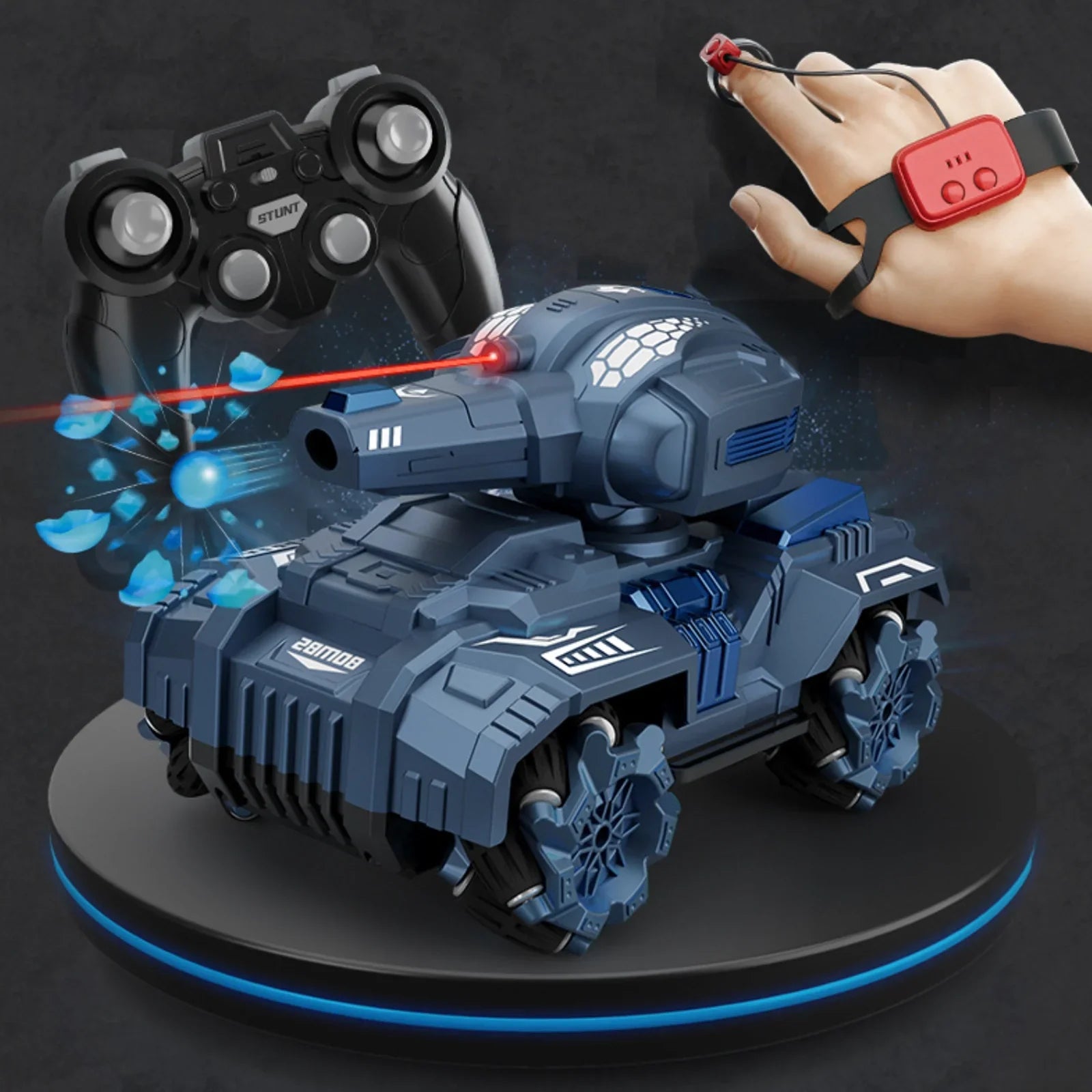 Mode de contrôle double : basculez entre la télécommande et la détection des gestes du poignet pour réaliser une variété d'opérations. Démonstration à un seul bouton : appuyez simplement pour démarrer l'impressionnant affichage des fonctions du réservoir. Mouvement complet : Profitez d'une maniabilité à 360° - vers l'avant, vers l'arrière, sur le côté et même en rotation ! Cascades cool : Équipé de roues de cascade élégantes, il peut réaliser des cascades accrocheuses et des démonstrations impressionnantes. Puissance de traction intégrale : Avec de solides performances sur tous les terrains, il est toujours prêt à relever les défis extérieurs. Tir infrarouge : utilisez la visée infrarouge pour améliorer la précision des frappes de précision. Longue durée de vie de la batterie : des batteries durables peuvent garder le jeu amusant pendant longtemps.