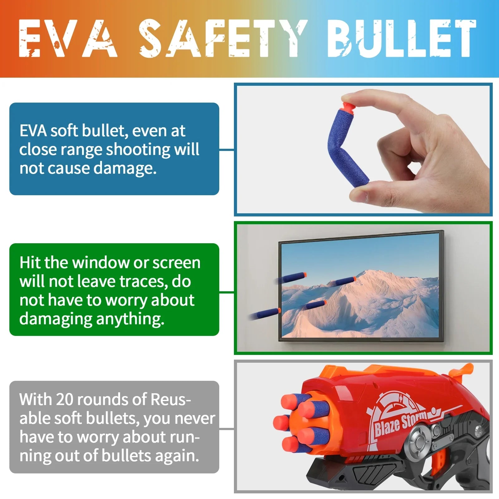 Mode de prise de vue : divisé en mode de prise de vue manuel à un coup et en mode de prise de vue semi-automatique à un coup, ce qui non seulement augmente le plaisir de la prise de vue, mais exerce également la capacité pratique et la coordination des enfants. Action de marteau rétractable : tirez 1 fléchette à la fois ou utilisez une action de claquement pour libérer rapidement les 5 fléchettes. Tambour rotatif : 5 balles peuvent être chargées et le tambour rotatif peut être tiré en continu sans décalage.