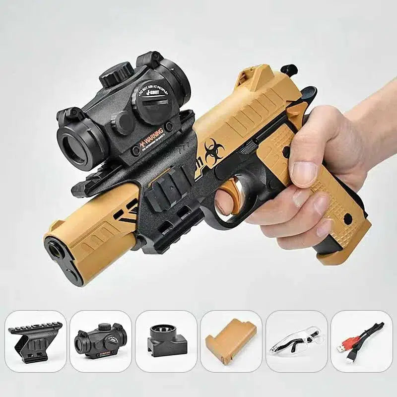 Le JF Electric Hopper-Fed 1911 Orbee Blaster est une arme puissante qui allie polyvalence et précision de tir. Il dispose de modes de tir manuels et entièrement automatiques flexibles et est équipé d'un système d'alimentation de chargeur à trémie fluide pour garantir que chaque tir est rapide et précis. Le corps du pistolet est équipé d'un support de rail, vous permettant d'installer un viseur laser ou une lampe de poche selon vos besoins pour améliorer l'efficacité et la précision du combat de nuit. Conçu spécifiquement pour tirer des billes de gel de 7 mm, ce pistolet offre une expérience de tir inégalée, vous aidant à faire face facilement à divers scénarios de combat.